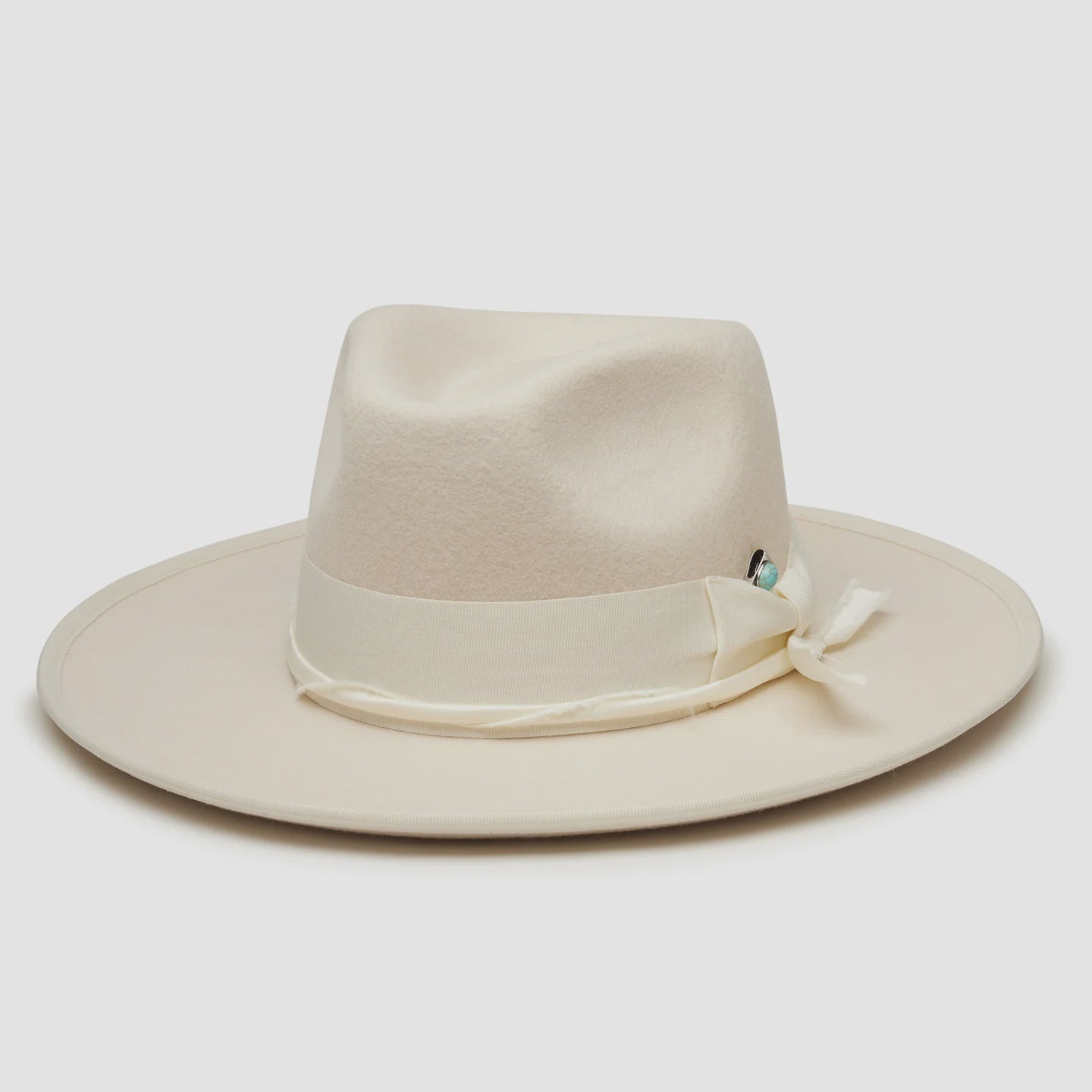 100% Australian wool wide brim rancher with gros grain ribbon brim and band.